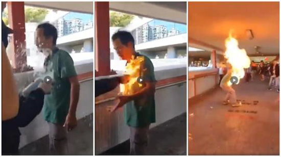 Comme le montre une vidéo qui circule en ligne, les vêtements de cet homme ont été enflammés par un manifestant radical après avoir été aspergés d'un produit accélérant alors qu'il se disputait avec plusieurs autres sur une passerelle piétonne à Ma On Shan, dans les Nouveaux Territoires. D'après la vidéo, lors de la confrontation, l'homme, vêtu d'une chemise verte, s'est disputé avec les manifestants et leur a dit qu'ils étaient tous chinois.