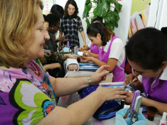 Des membres d'une délégation d'envoyés de l'ONU se font manucurer dans une école de formation professionnelle à Hotan, dans la région autonome ou?ghoure du Xinjiang (nord-ouest de la Chine), le 30 ao?t 2019. (Photo / Xinhua)