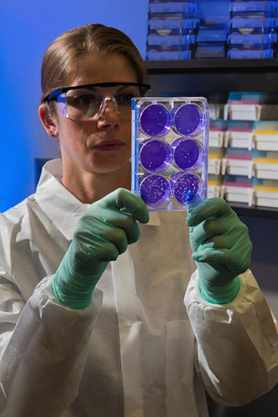 Une scientifique du Centre de contr?le et de prévention des maladies américain (CDC) examine le résultat d'un test sur plaque, qui est un test qui permet aux scientifiques de compter le nombre de particules du virus de la grippe dans un mélange (Photo d'archives). (Crédit photo / CDC)