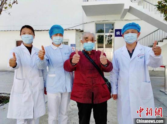 Un homme de 90 ans (2e à droite) sort de l'h?pital de Xiangyang, dans la province du Hubei (centre de la Chine) , le 15 mars 2020. (Photo / China News Service)