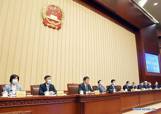 Li Zhanshu, président du Comité permanent de l'Assemblée populaire nationale (APN, parlement chinois), préside la réunion de cl?ture de la 22e session du Comité permanent de la 13e APN à Beijing, le 17 octobre 2020.