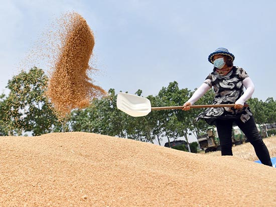 Un agriculteur utilise une pelle pour séparer les grains de blé de la balle dans le village de Zhangyao de la ville d'Erlang, dans le comté de Xiping de la province du Henan (centre de la Chine), le 26 mai 2020. (Photo / Xinhua)