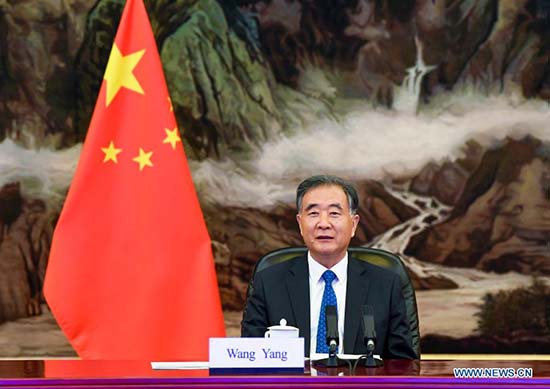 Le plus haut conseiller politique chinois, Wang Yang, a rencontré mercredi Sadiq Sanjrani, président du Sénat du Pakistan, par liaison vidéo, s'engageant à renforcer les échanges amicaux avec le Pakistan.