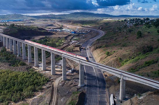 Un train de voyageurs vu sur un pont de la voie ferrée de construction chinoise reliant la capitale kényane Nairobi à Mombasa et Naivasha en 2017. (Chen Cheng / Xinhua)