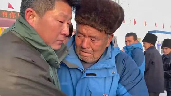 Le 7 février, Cao Yi, directeur du département consulaire de l'ambassade de Chine au Liban, a partagé une vidéo sur Twitter. Dans la vidéo, des villageois ou?ghours en larmes font leurs adieux à un cadre ayant travaillé dans le village. Un vieil homme ou?ghour sanglote et s'avance pour lui donner une accolade, tandis que le cadre, les yeux rouges, ne cesse de dire ? Merci, merci ?.