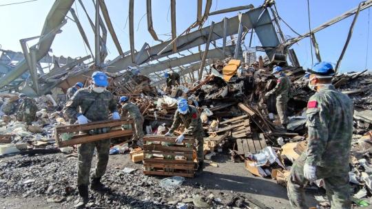 Des Casques bleus chinois nettoient les ruines des explosions du port de Beyrouth, au Liban, le 30 septembre 2020 (Photo / Xinhua)
