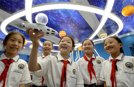 Le 18 juin 2021, des élèves de l'école primaire expérimentale du district de Hanshan de la ville de Handan, dans la province du Hebei (centre de la Chine), découvrent des connaissances aérospatiales à l'aide des modèles. (Hao Qunying / Pic.people.com.cn)