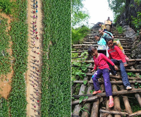 Sur cette photo combinée, la partie gauche prise le 10 mai 2019 avec un drone montre des enfants rentrant chez eux après l'école dans le village de Nongyong, et la partie droite prise le 3 septembre 2012 montre des enfants descendant les échelles suspendues pour se rendre à l'école dans le village de Nongyong, région autonome Zhuang du Guangxi (sud de la Chine). (Photo / Xinhua)