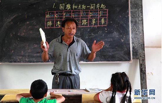 Lu Jiahong donne un cours aux deux seuls élèves du point d'enseignement de Kumatian, dans le comté de Quanzhou de la région autonome Zhuang du Guangxi (sud de la Chine), le 4 septembre 2014. Après avoir terminé ses études secondaires, Lu Jiahong a été enseignant rural à l'école primaire centrale de Dayuan en 1976. Six ans plus tard, ayant appris le manque d'enseignants de Kumatian, il proposa d'y travailler. Il y enseigne depuis. (Photo/Xinhua)