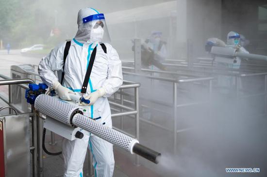 Des membres du personnel désinfectent l'entrée du site touristique du mont Tianmen en vue de sa réouverture à Zhangjiajie, dans la province du Hunan (centre de la Chine), le 26 ao?t 2021. (Photo/Xinhua)