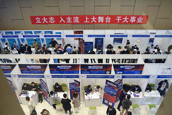 Des étudiants dipl?més recherchent des opportunités d'emploi lors d'un salon de placement à l'Université Tsinghua, le 16 mars 2021 à Beijing. (Photo/Xinhua)