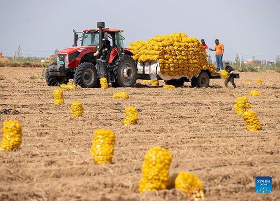 Des agriculteurs chargent des pommes de terre sur une remorque dans le village de Hongrui du comté de Pingluo, à Shizuishan, dans la région autonome Hui du Ningxia (nord-ouest de la Chine), le 2 septembre 2021. Pingluo a développé l'industrie de la plantation de pommes de terre ces dernières années pour aider les villageois locaux à augmenter leurs revenus. (Photo/Xinhua)