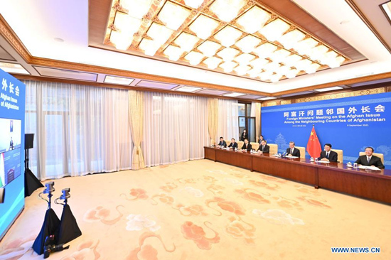 Le conseiller d'Etat et ministre des Affaires étrangères de la Chine Wang Yi a assisté mercredi, à Beijing, par liaison vidéo, à la première réunion des ministres des Affaires étrangères des pays voisins de l'Afghanistan.