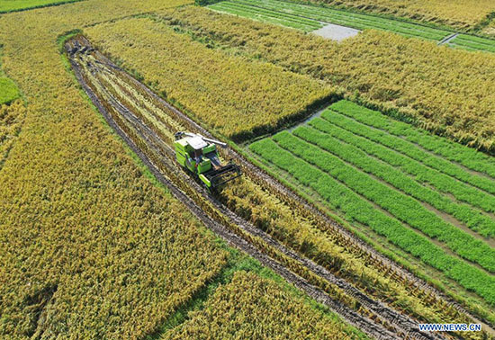Photo aérienne prise le 20 juillet 2021 montrant une moissonneuse récoltant du riz dans un champ dans le village de Baishizhai du canton de Shouyan, dans le comté de Daoxian de la ville de Yongzhou, dans la province du Hunan (centre de la Chine). (Photo/Xinhua)