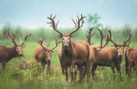 Un troupeau de cerfs milu, ou cerfs du Père David, aper?u dans la réserve naturelle nationale de Milu Shishou à Shishou, dans la province du Hubei (nord de la Chine), en mai. (Photo/Xinhua)