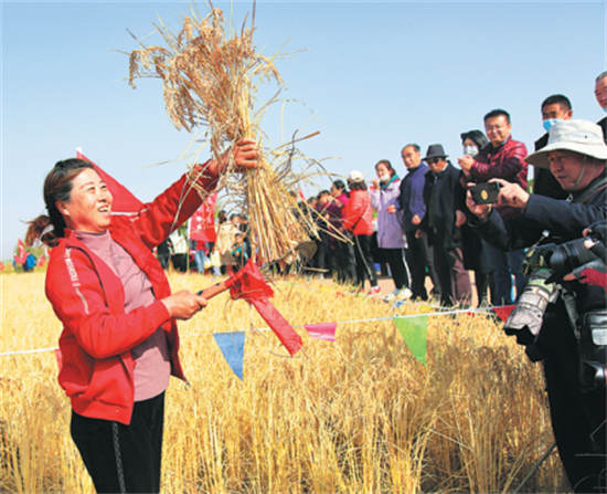 Une agricultrice démontre l'utilisation d'une faucille dans la culture du riz lors d'un événement à Zhangye, dans la province du Gansu (sud-ouest de la Chine), au cours duquel la 41e Journée mondiale de l'alimentation a été célébrée. (Chen Li / China News Service)