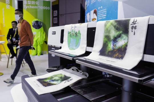Photo prise le 5 novembre 2021 montrant des sacs à main imprimés avec de l'encre respectueuse de l'environnement sur le stand de DuPont lors de la 4e Exposition internationale de l’importation de Chine (China International Import Expo, CIIE) à Shanghai (est de la Chine). (Zhang Yuwei / Xinhua)