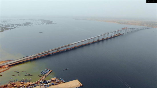 Photo prise en ao?t 2021 montrant les travaux du pont de Foundiougne construit avec l'aide chinoise sur le point d'être achevés. Une fois terminé, le pont améliorera considérablement les conditions de circulation locale et deviendra le plus grand et le plus long pont du Sénégal. (Photo reproduite avec l'aimable autorisation de China Henan International Cooperation Group Co., Ltd.)