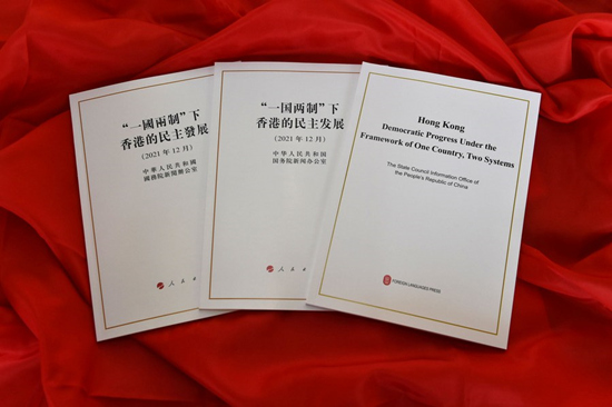 Des exemplaires d'un livre blanc intitulé "Hong Kong : progrès démocratiques dans le cadre d'un pays, deux systèmes", le 20 décembre 2021. (Photo/Xinhua)