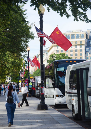 Cette photo d'archive montre les drapeaux nationaux de la Chine et des Etats-Unis ainsi que les drapeaux de Washington D.C. sur l'Avenue de la Constitution à Washington, capitale des Etats-Unis. (Xinhua/Bao Dandan)