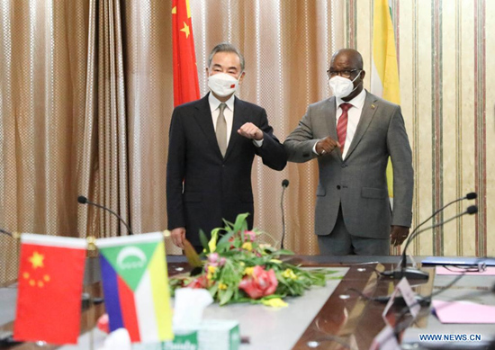 Wang Yi, conseiller d'Etat et ministre des Affaires étrangères de Chine, a rencontré jeudi le ministre comorien des Affaires étrangères Dhoihir Dhoulkamal à Moroni, la capitale des Comores.