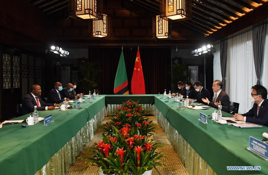 Le conseiller d'Etat et ministre des Affaires étrangères de la Chine, Wang Yi, s'est entretenu samedi avec le ministre zambien des Affaires étrangères et de la Coopération internationale Stanley Kasongo Kakubo, à Tunxi, dans la province de l'Anhui (est).