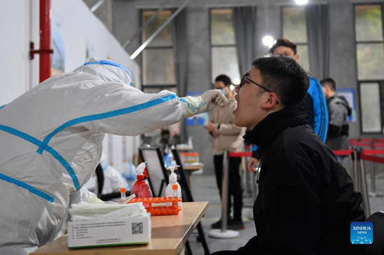 Un travailleur médical prélève un échantillon sur écouvillon d'un résident pour un test d'acide nucléique de la COVID-19 à Changsha, capitale de la province du Hunan (centre de la Chine), le 22 mars 2022. (Photo / Xinhua)
