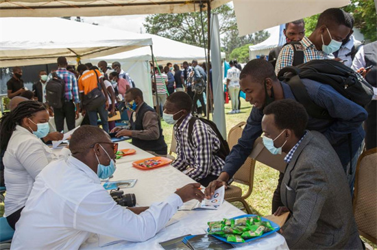 Des gens visitent un salon des emplois et carrières dans l'université de Zambie à Lusaka, le 27 octobre 2021. (Xinhua/Martin Mbangweta)