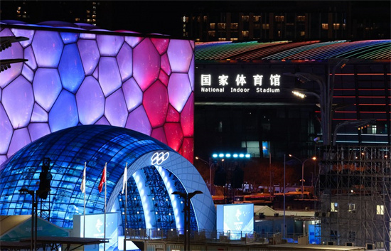 Le Centre aquatique national (également connu sous le nom de "Cube de glace"), le Palais national omnisports et la Place des médailles de Beijing des Jeux olympiques d'hiver après la cérémonie d'ouverture des Jeux olympiques d'hiver de Beijing 2022 au Stade national, à Beijing, capitale chinoise, le 4 février 2022. (Wang Jingqiang/Xinhua)