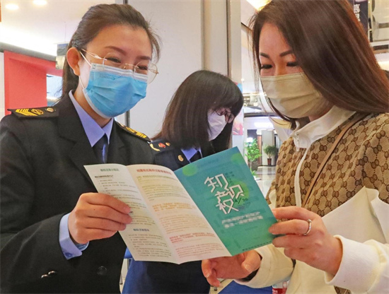 Le 20 avril 2022, des personnels de l'Administration pour la régulation des marchés (l'Administration de la propriété intellectuelle) présentent des informations sur la propriété intellectuelle à un commer?ant dans l'arrondissement de Haigang de la ville de Qinhuangdao de la province du Hebei (dans le nord de la Chine). (Cao Jianxiong/Pic.people.com.cn)