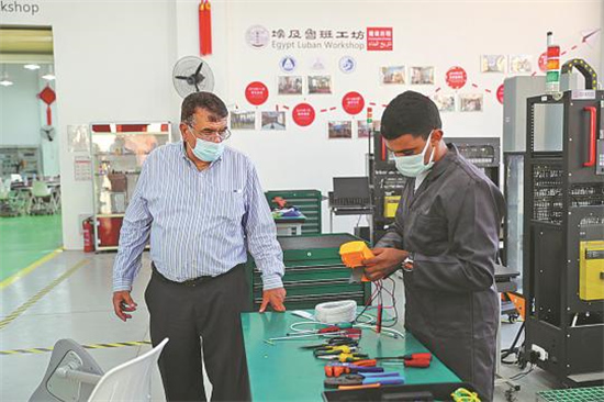Un stagiaire est guidé dans un atelier Luban au Caire, en égypte, le 16 ao?t 2021. Les ateliers soutenus par la Chine offrent une formation professionnelle. (Photo / Xinhua)