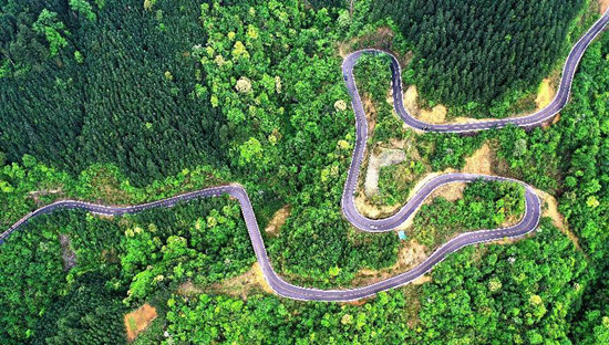 Le 25 avril 2022, la photo montre une vue aérienne d'une route à la campagne dans le comté de Rongjiang de la préfecture autonome Miao et Dong de Qiandongnan de la province du Guizhou (dans le sud-ouest de la Chine). (Li Changhua/Pic.people.com.cn)