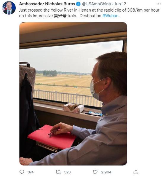Nicholas Burns, l'ambassadeur des états-Unis en Chine, a déclaré qu'il avait été impressionné par le train à grande vitesse chinois Fuxing lors de sa visite à Wuhan depuis Beijing le 12 juin. Il a posté une photo sur Twitter dans laquelle on le voit assis près de la fenêtre de la voiture lorsque le train est arrivé dans la province du Henan (centre de la Chine), disant : ? Je viens de traverser le fleuve Jaune dans le Henan à la vitesse rapide de 308 km/h sur cet impressionnant train 復興號. Destination #Wuhan ?.