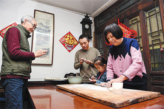 Zhu Maojin, sa femme, son fils et sa petite-fille préparent des raviolis chez eux à Beijing en janvier 2020. (Ju Huanzong / Xinhua)