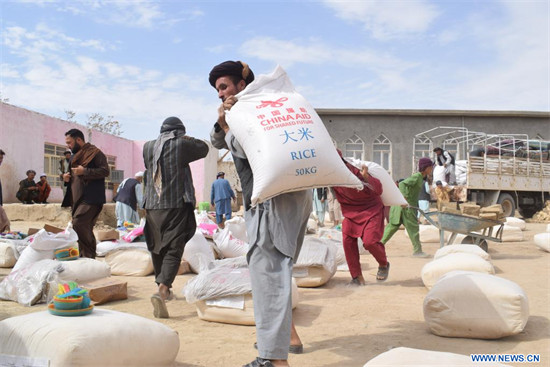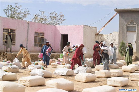 Des Afghans transportent des articles de secours donnés par la Chine dans la province de Jawzjan en Afghanistan, le 24 ao?t 2022. Un total de 75 familles qui ont perdu leurs maisons dans un récent incendie survenu dans le district de Faizabad, dans la province de Jawzjan (nord), ont re?u des aides humanitaires données par la Chine, a déclaré jeudi un responsable provincial.