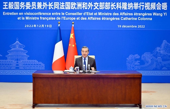 Le conseiller d'Etat et ministre des Affaires étrangères de la Chine, Wang Yi, a rencontré lundi par liaison vidéo la ministre fran?aise des Affaires étrangères, Catherine Colonna.