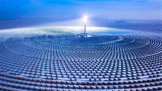 Plus de 10 000 héliostats entourent la tour d'absorption de chaleur en cercles concentriques après la neige, dans le parc industriel photoélectrique de la ville de Dunhuang, dans la province du Gansu, offrant une scène spectaculaire, le 3 décembre 2022. (Wang Binyin / Pic.people.com.cn)