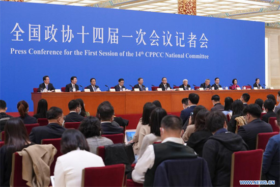 Des dirigeants des comités centraux des partis politiques non communistes et de la Fédération nationale de l'industrie et du commerce de Chine assistent à une conférence de presse lors de la première session du 14e Comité national de la Conférence consultative politique du peuple chinois (CCPPC) au Grand Palais du Peuple à Beijing, capitale de la Chine, le 5 mars 2023.
