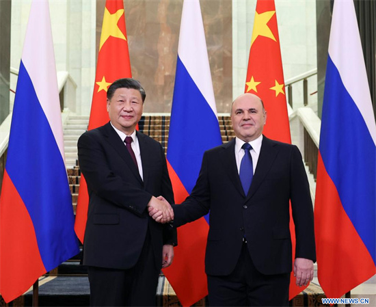 Le président chinois Xi Jinping rencontre le Premier ministre russe Mikha?l Michoustine à Moscou, en Russie, le 21 mars 2023. (Xinhua/Zhang Ling)