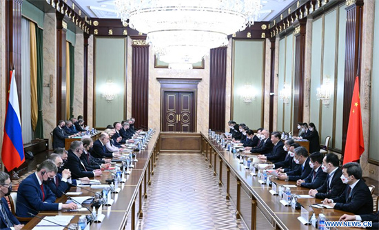 Le président chinois Xi Jinping rencontre le Premier ministre russe Mikha?l Michoustine à Moscou, en Russie, le 21 mars 2023. (Xinhua/Ding Haitao)