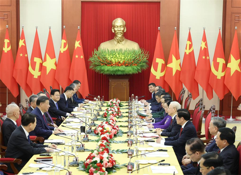 Xi Jinping et Ngyuen Phu Trong ont noté que les deux pays devraient perpétuer l'amitié traditionnelle forgée par leurs dirigeants de l'ancienne génération, travailler ensemble à la construction de la communauté de destin, poursuivre leurs voies de modernisation respectives et réaliser des bénéfices mutuels et le développement partagé pour contribuer au bien-être des deux peuples de même qu'à la paix et à la prospérité dans la région.