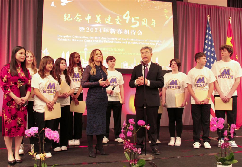 Lors d'une réception organisée mardi pour le 45e anniversaire de l'anniversaire de l'établissement des relations sino-américaines, le consul général chinois Zhao Jian a remis la lettre à Jennifer Fridley, directrice de l'école secondaire Susan Clark du district communautaire scolaire de Muscatine, en présence de centaines de personnes de tous les milieux à Chicago.