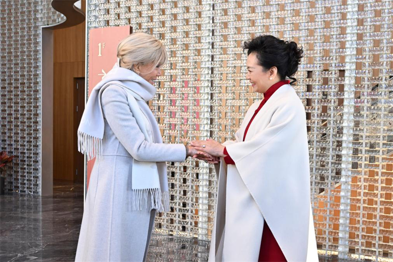 Peng Liyuan, épouse du président chinois Xi Jinping, et Brigitte Macron, épouse du président fran?ais Emmanuel Macron, ont visité jeudi le Théatre de l'art du peuple de Beijing (Beijing People's Art Theatre, BPAT).