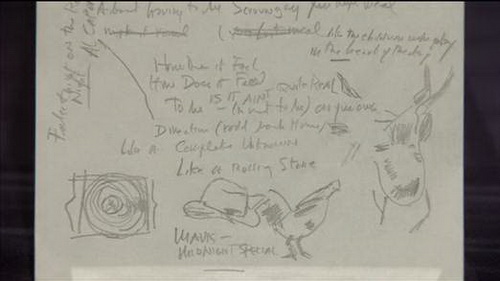 Les paroles mythiques sont bien lisibles dans le gribouillage de Dylan : ? How does it feel, To be on your own, No direction home, Like a complete unknown, Like a rolling stone ?.