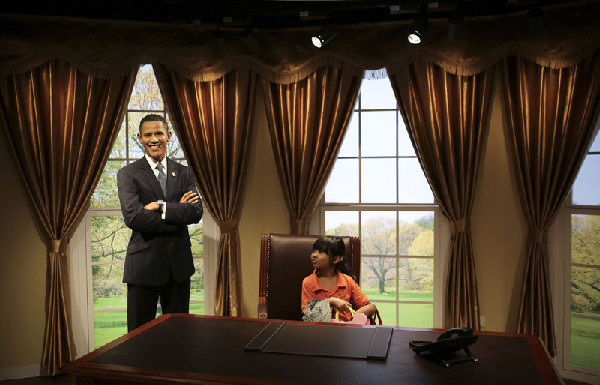 Une jeune étudiante chinoise regarde un personnage de cire à l'effigie de Barack Obama dans une reproduction du bureau ovale de la Maison Blanche, au musée Madame Tussauds de Beijing, le 19 septembre 2014.