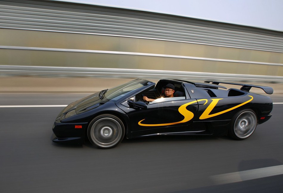 Wang Yu, un jeune Chinois, au volant à Beijing de sa propre réplique d'une Lamborghini Reventon.