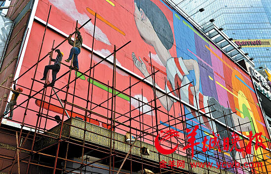 Une vue du graffiti géant sur un panneau extérieur du Zhengjia Plaza à Guangzhou. [Photo / ycwb.com]