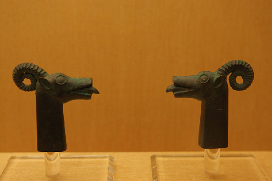 | Deux têtes de béliers parmi les objets de l'Exposition de l'année de la chèvre au Musée de la Capitale. [Photo:chinadaily.com.cn] |
