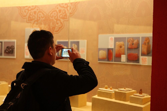 | Un visiteur prend un cliché de l'exposition de moutons au Musée de la Capitale. [Photo: chinadaily.com.cn] |