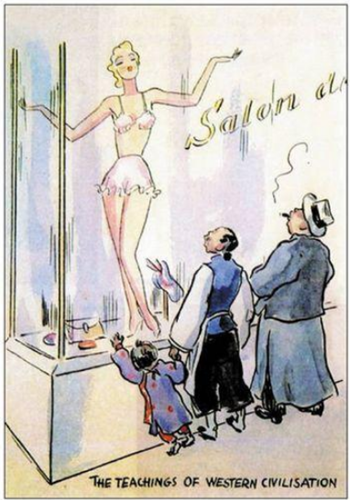 5.Une bande dessinée du peintre autrichien Schiffdans les années 1930 représente un magasin de Shanghai affichant la mode occidentale. [Photo/ifeng.com]